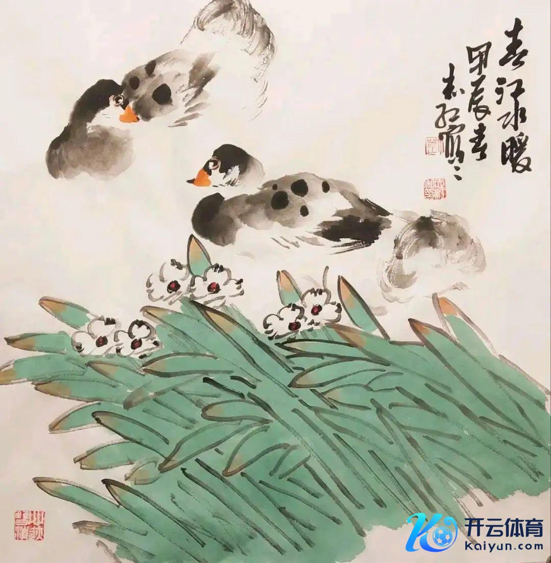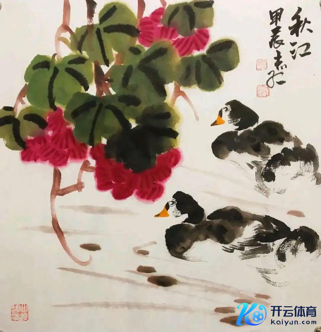 而在刻画鸟雀等动物时,用笔则愈加天真多变。以侧锋和散锋相统一,通过笔触的轻重、缓急来弘扬鸟雀的羽毛质感和动态。在画鸭子的小品中,鸭的羽毛用自便的笔触弘扬,寥寥几笔,就勾画出鸭子优哉游哉的神气,仿佛它们正畅游在宁静的水面上。