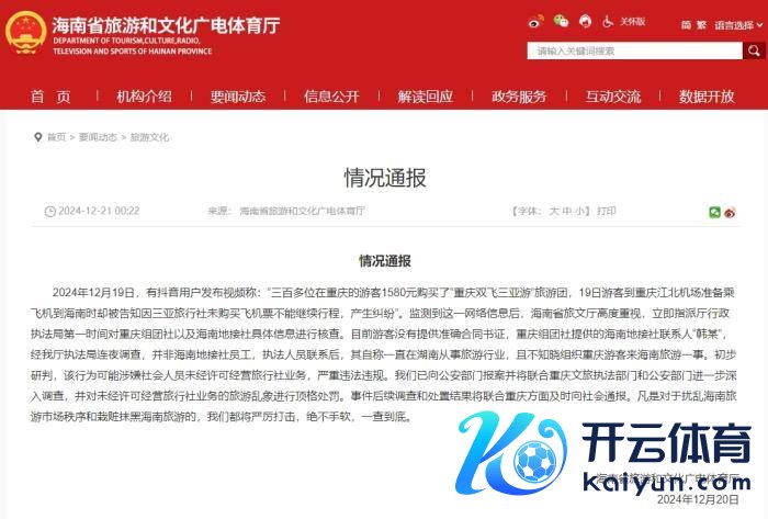 中新网12月21日电 2024年12月19日,有抖音用户发布视频称:“三百多位在重庆的搭客1580元购买了“重庆双飞三亚游”旅游团,19日搭客到重庆江北机场准备乘飞机到海南时却被见告因三亚旅行社未购买飞机票不成无间行程开云Kaiyun·体育官方网站 登录入口,产生纠纷”。海南省旅游和文化广电体育厅20日就此发布情况通报。