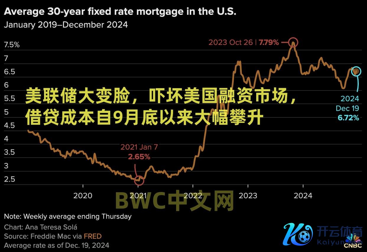 据好意思联储在12月23日提供的数据,截止12月19日(即好意思联储会议召开后的第二天),30年期固定利率典质贷款利率飙升至6.72%,这一数字高于前一周的6.60%,这标明尽管好意思联储在上周三文告2024年第三次降息,但好意思国的融资贷款利率仍然上涨,假贷老本自9月底以来大幅攀升,这与好意思国的降息周期形成了昭着的反差,以抒发好意思国国债利率对特朗普归位的负面订价。