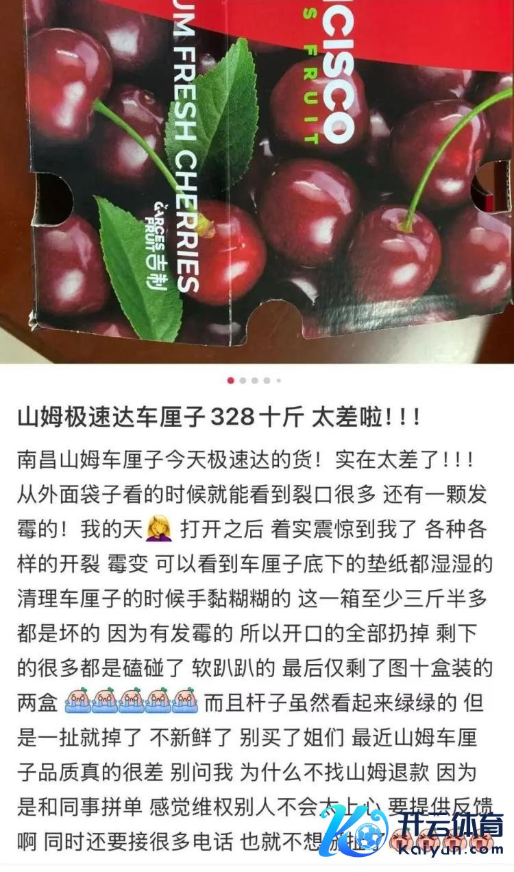 九派新闻幽闲到,一位IP为江西南昌的糜掷者发帖称,我方通过南昌山姆极速达购买了十斤车厘子,品种为拉宾斯,价钱为328元。“灵通之后,多样种种的开裂、霉变,不错看到车厘子下面的垫纸王人湿湿的。”其称,一箱内至少有三斤为坏果,由于跟共事拼单就莫得退货。