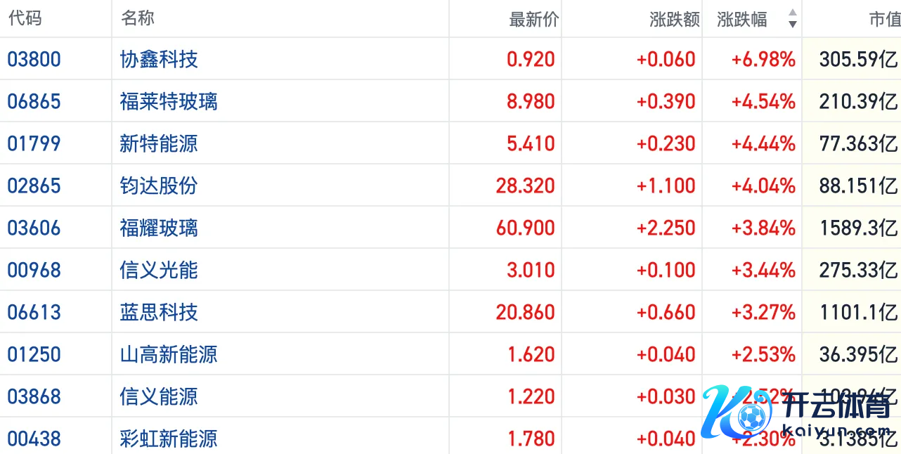 限度发稿,协鑫科技(03800.HK)涨近7%,新特动力(01799.HK)涨超4%,信义光能(00968.HK)等多股涨逾2%。