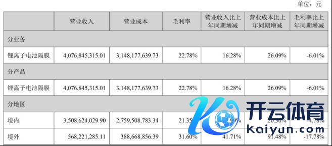 电板隔阂家具的价钱和毛利率抓续下滑,是公司净利润下滑的主要原因。2025年年报涌现,公司锂离子电板隔阂新动力材料销售量为46.65亿㎡,同比增长17.03%,对应家具单价为0.87元/㎡,同比下滑0.62%。同期,公司家具销售毛利率为22.78%,同比下滑了6.01个百分点,三年间毛利率近乎“腰斩”。