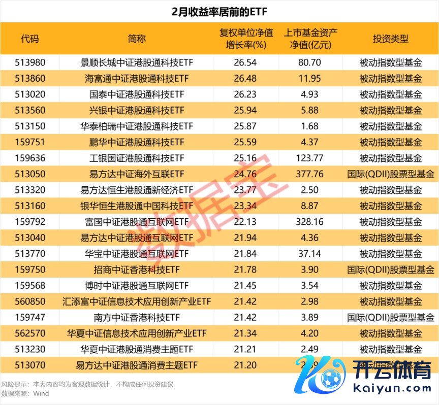 对应到ETF商场(被迫指数型、QDII股票型),2月有30只ETF复权单元净值高潮幅度特地20%,港股通科技主题实在变成驾驭,景顺长城中证港股通科技ETF、海富通中证港股通科技ETF、国泰中证港股通科技ETF等7只港股通科技ETF复权单元净值增长率特地25%。