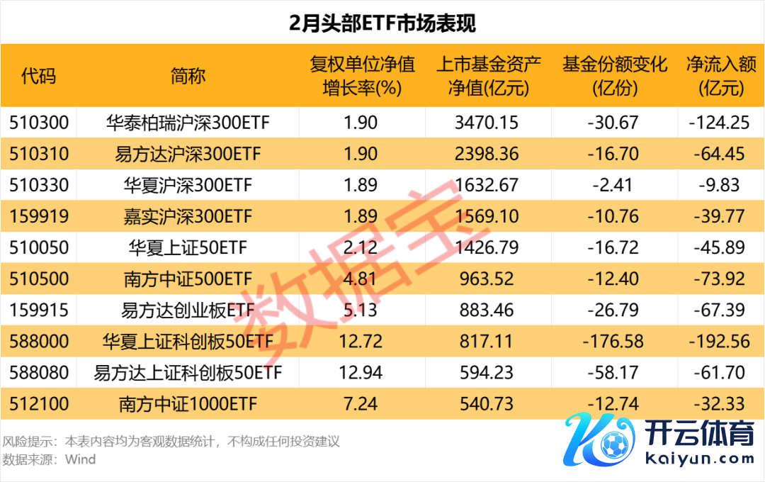 2月,跟着A股大盘抓续上行,头部ETF(最新钞票净值500亿元以上)举座弘扬可圈可点。其中,科创50大涨12.95%,带动关系宽基指数基金终了大幅高潮。值得温存的是,头部ETF天然单元净值抓续增长,但资金却昭着外流,基金份额也随之大幅减少。