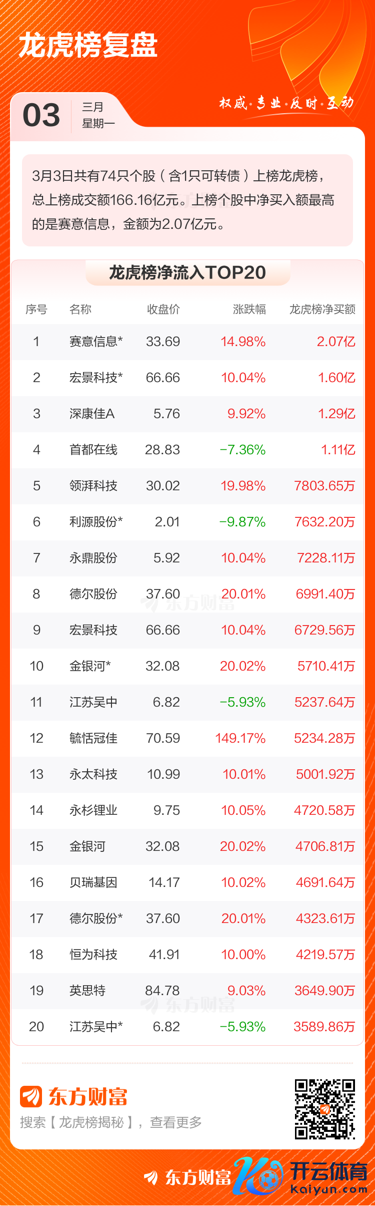 3月3日共有74只个股(含1只能转债)上榜龙虎榜,总上榜成交额166.16亿元。上榜个股中净买入额最高的是赛意信息,金额为2.07亿元。