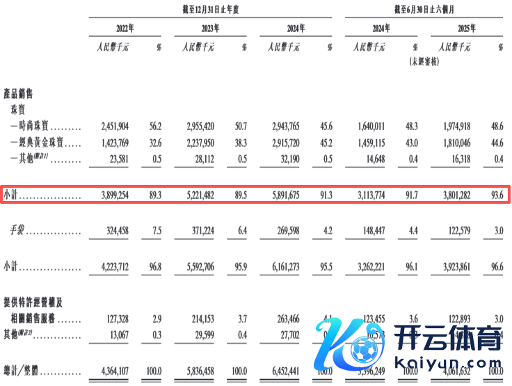 招股书(报告稿)浮现,2022年、2023年、2024年及2025年上半年(以下简称论说期内),潮宏基的营收主要来自珠宝(包括前卫珠宝、经典黄金珠宝过火他)的销售,营收占比远离为89.3%、89.5%、91.3%及93.6%。