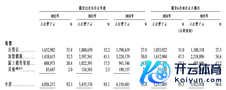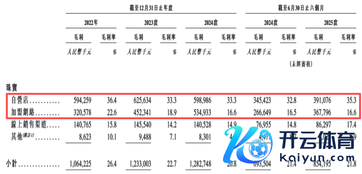 除线下珠宝店外,放肆招股书(报告稿)裸露日,潮宏基远离在京东、天猫、唯品会等14个中国内田主要线上销售平台销售家具。珠宝的线上销售收益从2022年的8.89亿元增至2024年的9.42亿元。2025年上半年,潮宏基录得珠宝线上销售收益4.96亿元。放肆2025年上半年末,潮宏基有632个告成加盟商、14个区域加盟商及215个次级加盟商。